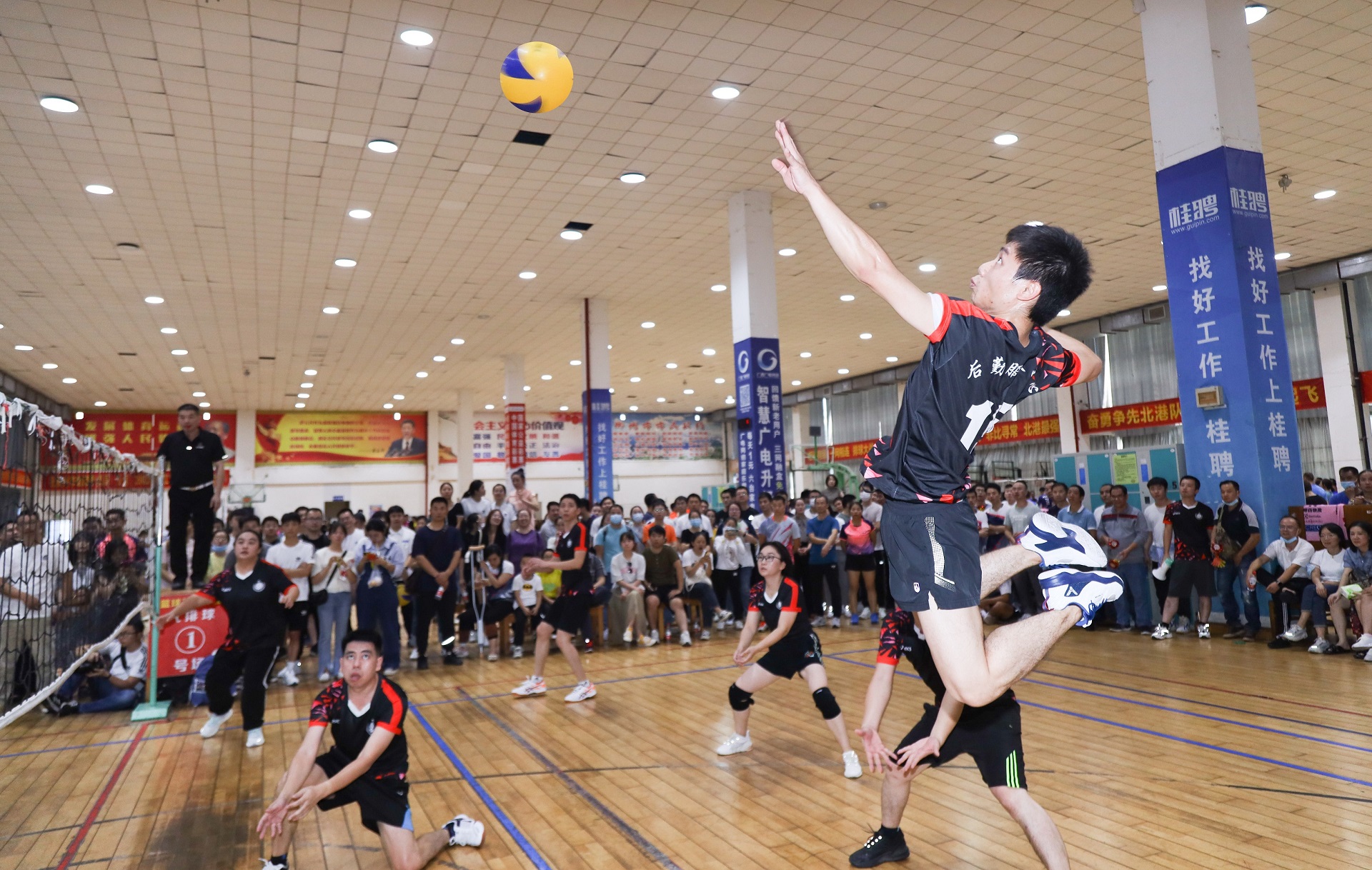 比赛现场,运动员们敏捷跑位,起跳拦网,扣杀有力,在赛场上尽情挥洒汗水,比赛高潮迭起扣人心弦。赛场边,啦啦队员们为场上队员呐喊助威,鼓舞了球队的士气,为紧张的比赛增添了一丝光彩。
