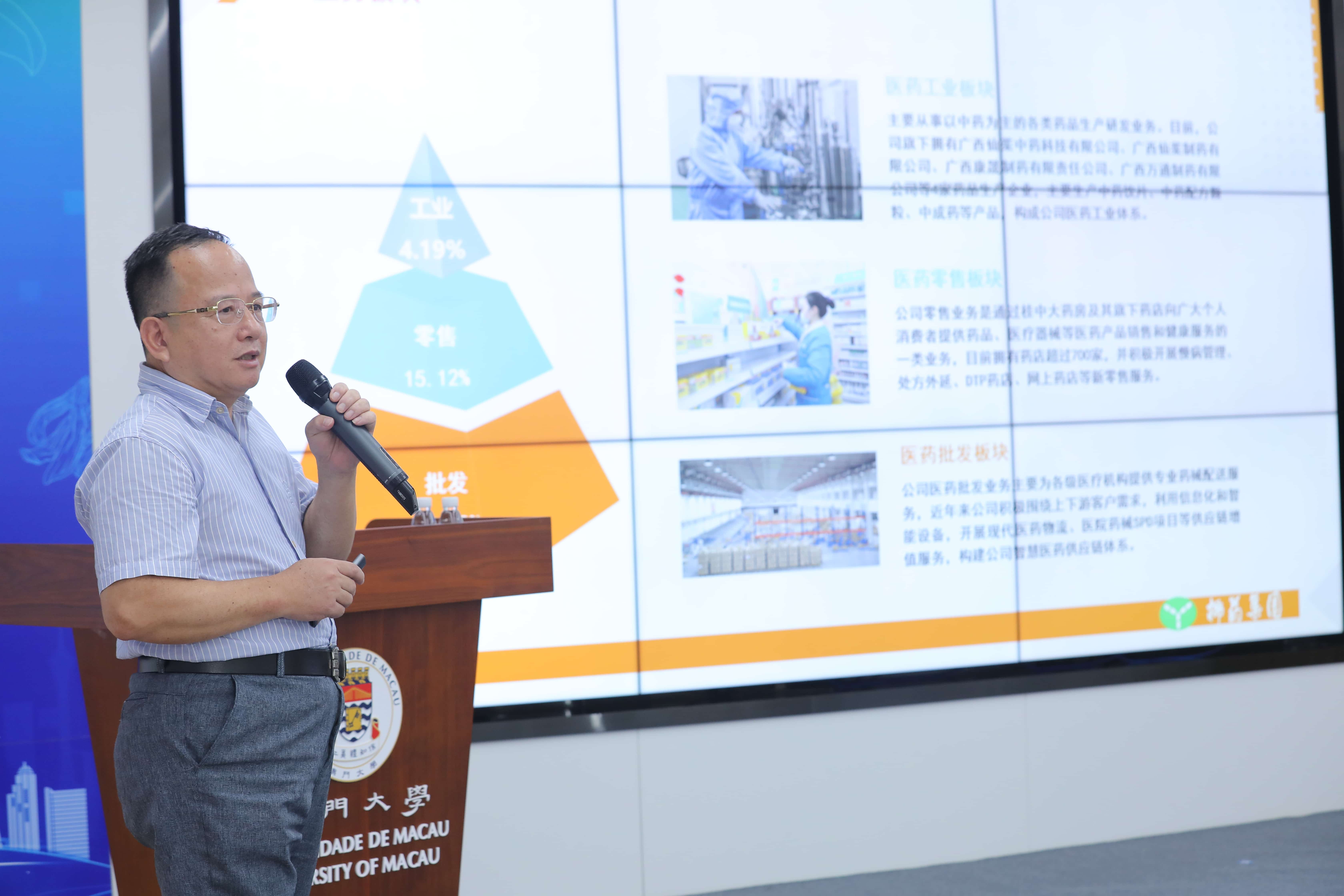 仪式后,澳门中药研发中心主任、中药质量研究国家重点实验室(澳门大学)创始主任王一涛教授作为该联合实验室的项目负责人,以“善用澳门横琴优势,共建产学创新平台”为主题进行专题分享。他提到,珠研院设立的中华医药研发中心有效助推研究成果转化,相信与柳药集团这样优秀的知名药企合作能促进产学研协同创新发展,助力澳门产业多元化发展及中医药产业转型升级,并且有效拓展东盟国家、「一带一路」沿线国家、葡语系国家等海外市场,提高中医药产业的国际影响力。